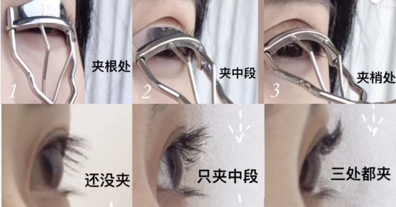 首先第一步就是先夹睫毛!如果睫毛比较短的女孩,建议使用三段式夹睫毛方法,这样睫毛就可以站得超翘~首先第一段先夹睫毛根部,大约停留10-20秒,再往上夹中段、顶端的睫毛,如果觉得不够翘,可以一直重复这个循环,直到睫毛开屏为止!