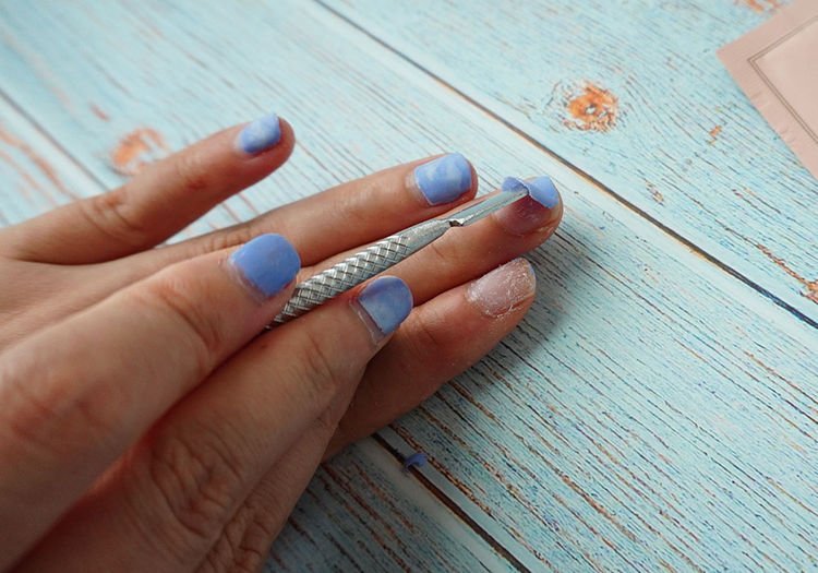 拆开卸甲包后,用推棒推走溶化了的甲油,如果甲油还没彻底软化,千万不要硬推,重新包起来等3分钟再卸就好。