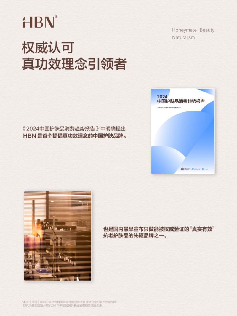 数据显示,2022年至2026年间,中国功效性护肤品复合年均增长率将达到13.9%,远超护肤品全品类的5.5%。在这样一个充满潜力的市场中,护肤品牌为了争夺市场份额,从成分、浓度到营销、科研等方面不断“内卷”,但随着消费者护肤知识的提升和科学护肤理念的普及,依靠堆砌成分浓度来吸引消费者的做法已逐渐失效。消费者更加关注的是产品的真正效果和成分的科学依据。HBN作为中国功效护肤领域的先行者,通过持续加大科研投入,建立了深厚的科研根基,并始终坚守“真功效”的理念。