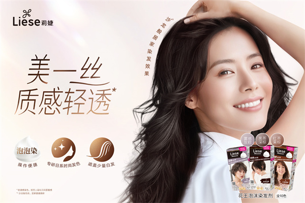 多年深耕亚洲秀发美学领域,“莉婕”一直关注中国生活者的日常需求,不断拓宽染发品类的功能,将人生自洽的理念融入染发美学,鼓励大家不为人生设限,焕发每一种“色彩”。深度洞察女性对美的意识变化,“莉婕”推出全新10色质感“花王泡沫染发剂” ,彩染遮白一步到位,推动染发时代迈向“重焕生命力”阶段。