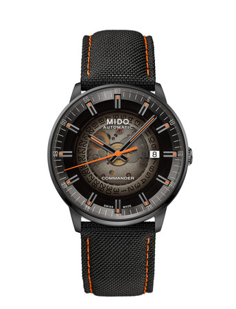全新的Commander Gradient香榭系列渐层80小时腕表,渐变的烟煤灰色半透明面盘让自动机械机芯若隐若现,其实细看可欣赏日期转盘的旋转运作,充满赏玩趣味,而黑色表壳配上橙色指针,正是MIDO的代表配色。