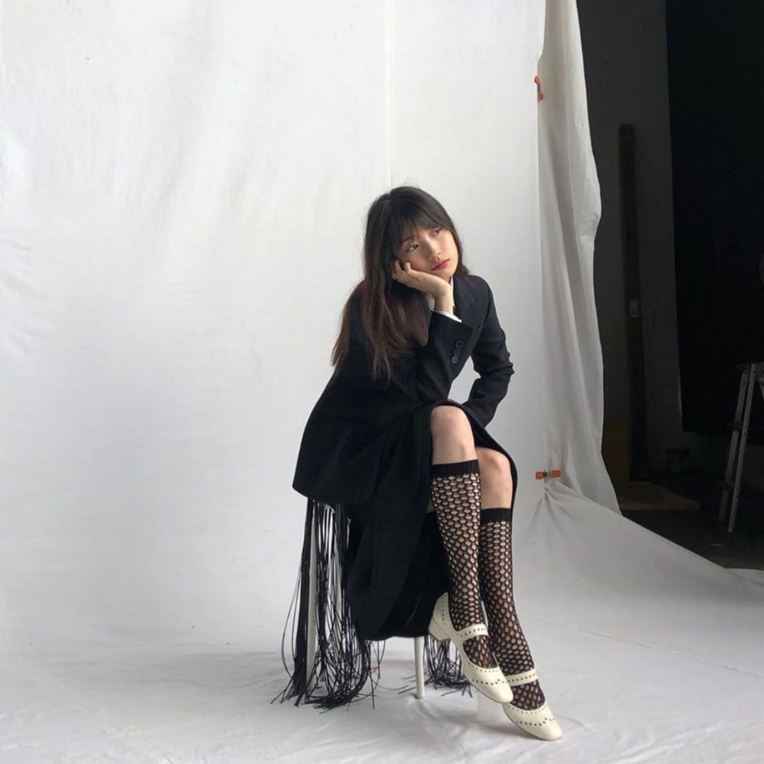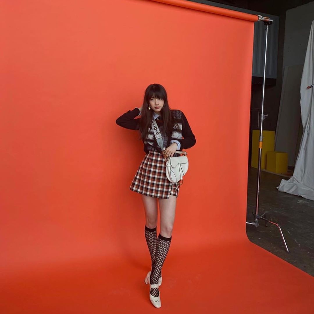 前阵子在IG上晒出穿搭的秀智,穿著有点正式的西装及学院风格纹短裙,却反差搭配DIOR洞洞丝袜,意外地甜美惹火,优雅造型也更加吸睛,脚踩珍珠米白的玛莉珍鞋与黑色洞洞袜做出对比,让焦点集中在她的长腿上。
