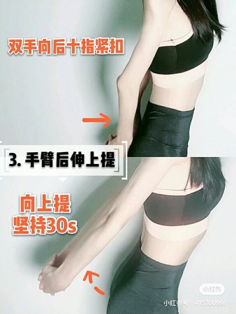 双手向后十指紧扣,向上提30秒,之后放下休息5秒。
