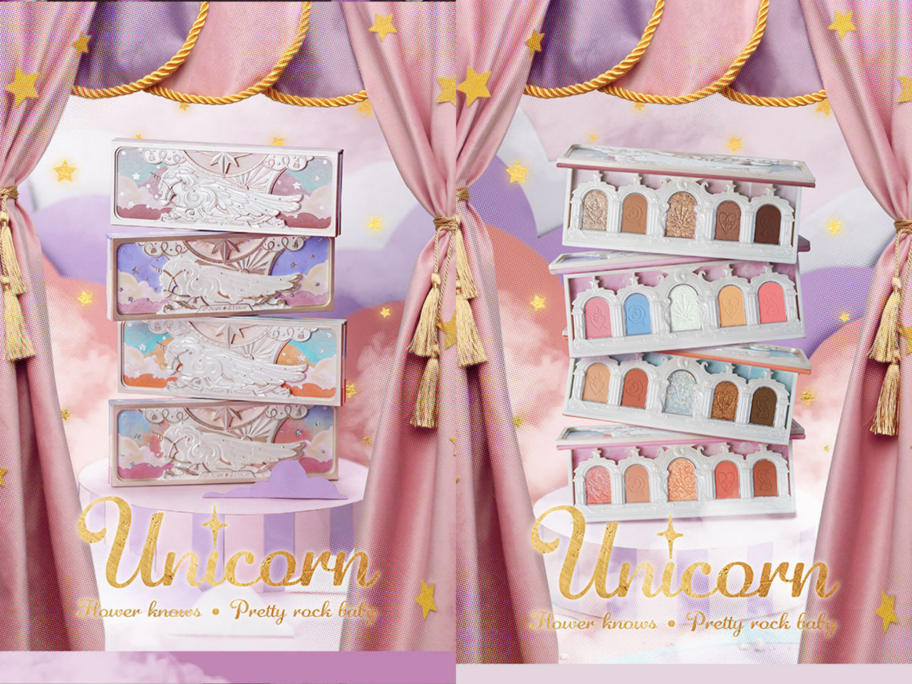 最近洗版到不行的FLOWER KNOWS其实是出自大陆的品牌,名为“花知晓”,不但在大陆当地爆红,甚至还火到日本、韩国去,可见它的包装是真心浮夸又打中女孩的心,以金属色搭配立体的独角兽、星星、欧式风格窗框,里面则是眼影的颜色,夸张度简直满分。