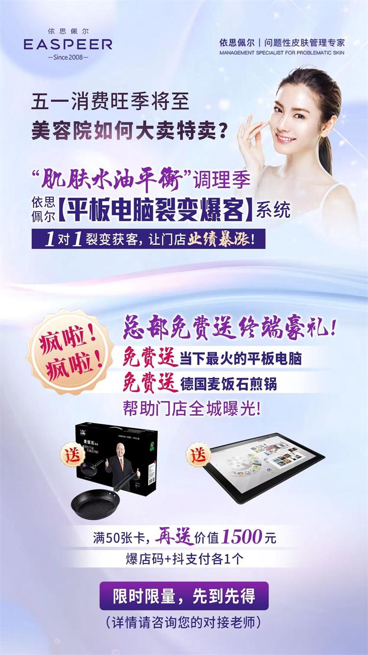 【依思佩尔“平板电脑裂变爆客系统”】,平板电脑免费送,厂家总部直接助力,礼品我来,拓客我来,成交我来,服务我来,赚钱你来。送产品、送礼品、包店销,先卖卡后拿货。终端1对1裂变爆客,疯狂席卷全城A客。从此告别拓客就亏本的模式!厂家前所未有的让利扶持,让顾客抢着买单!让美容师抢着推销!让老板收钱收到手软!