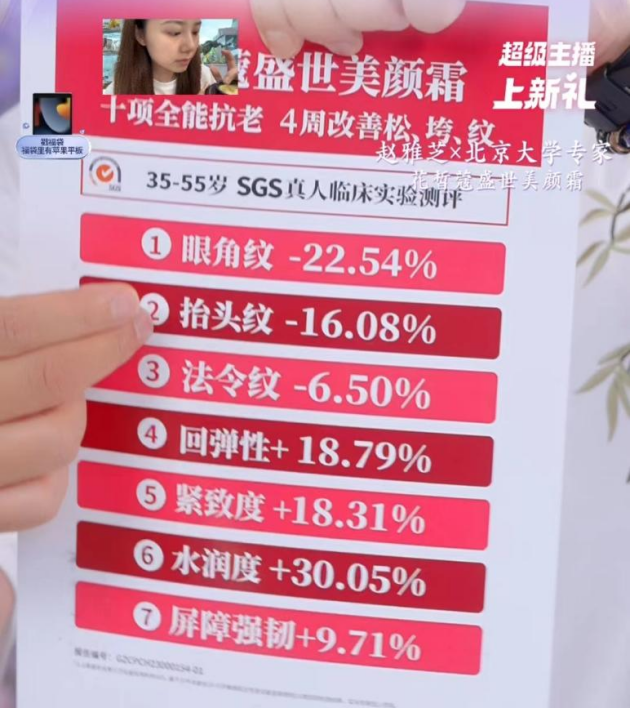 除了讲解,北大夫妇还向赵雅芝及千万粉丝展示了产品的透明成分及瑞士SGS亲测报告,并有用户现身对比,可5天抗皱+48% ,2周显著改善松、垮、纹等10种老化问题。同时花皙蔻还斥资55万,经由北京大学与未名拾光联合实验室做产品功效横向对比,在与市面国际大牌、售价高达4-5000的面霜中,牡丹抗老盛世美颜霜表现卓越,功效完胜。