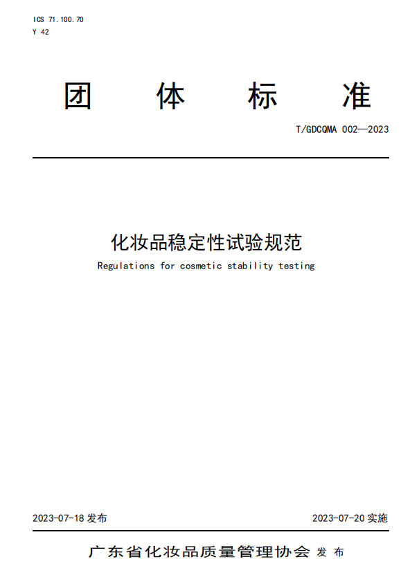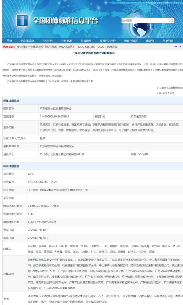 2023年7月18日,由国家药监局化妆品安全评价重点实验室、广东省化妆品质量管理协会、广东省生物制品与药物研究所、花皙蔻品牌母公司(美出莱(杭州)化妆品有限责任公司)等多家单位共同起草的《化妆品稳定性试验规范》团体标准,于7月20日正式实施。