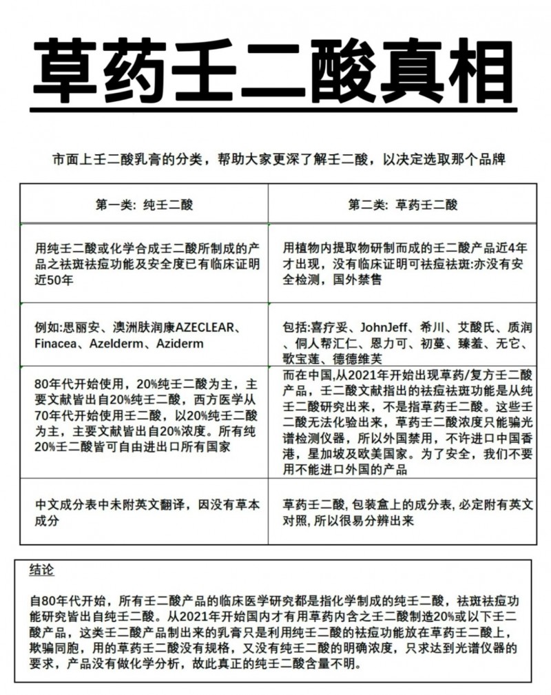 近期 多人在谈论壬二酸的真假, 市面上 充斥着 冒充 纯 壬二酸产品 的 草药壬二酸 , 這類「假壬二酸」产品是 从植物中提取 草药 壬二酸而造成 , 而 草药 壬二酸 因没有 临床验证 证明能祛痘祛斑 ,在 国外禁售 的, 只要 你比较