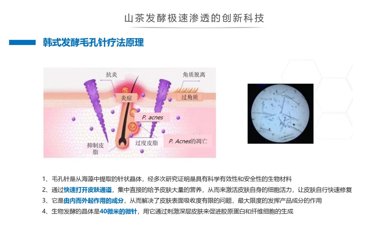 首先它采用了神奇的韩式发酵毛孔针疗法,集美们是不是第一次听说这个概念?这个的厉害之处就是在于它可以直接把有效成分送入到皮肤深层的问题部位,不受皮肤吸收能力的影响。山茶发酵祛痘系列的精华中含有这种发酵毛孔针成分,它是通过独特的生物发酵工艺产生的仅有40微米的针状晶体,这种晶体随着拍打会直接透入发炎的毛孔深层,后开始溶解针对发炎的毛孔深层和痤疮杆菌开始起作用。韩式发酵毛孔针疗法就没有这个问题,所以这就是仙竹社山茶发酵祛痘产品的作用这么神奇的原因之一。